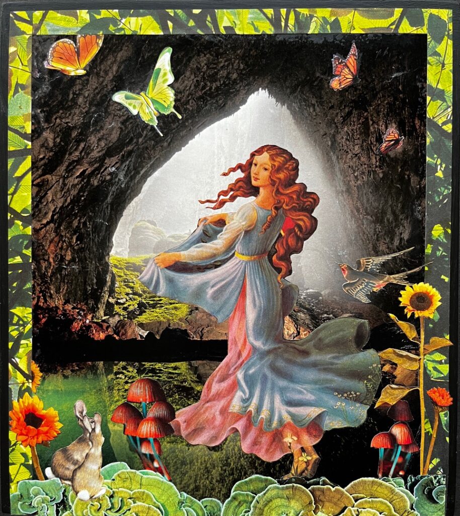 Having worked in a variety of mediums over the years, I currently find joy and fulfillment combining collage and paint. In my quest to create eclectic collages, I use found and hand painted papers, old family letters, magazines, and an assortment of collected ephemera.